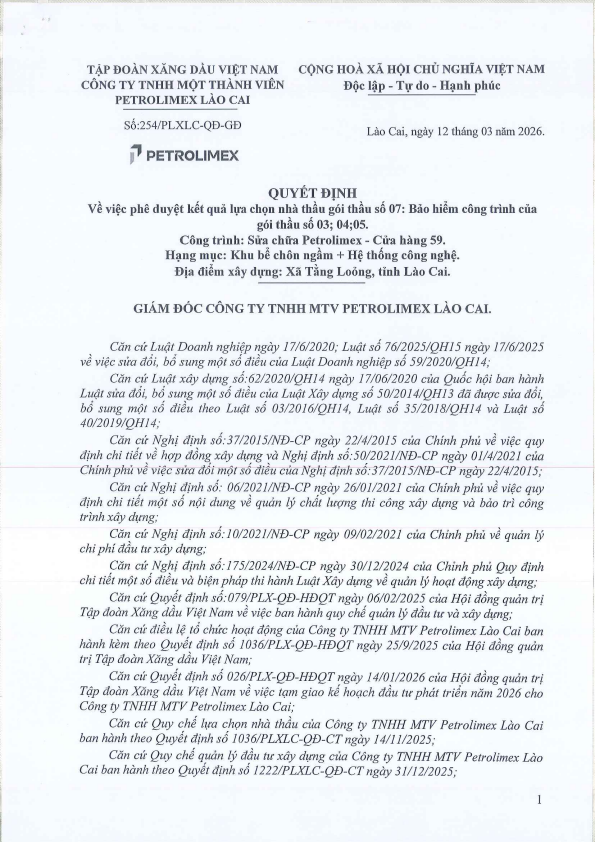 QĐ V/v phê duyệt Kết quả lựa chọn nhà thầu gói thầu số 07: Bảo hiểm Công trình của gói thầu số 03,04,05. Công trình: Sửa chữa Petrolimex-CH59. Hạng mục: Khu bể chôn ngầm+hệ thống công nghệ. Địa điểm xây dựng: Xã Tằng Loỏng, Lào Cai