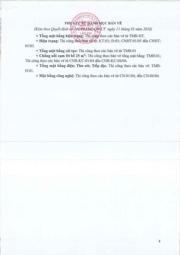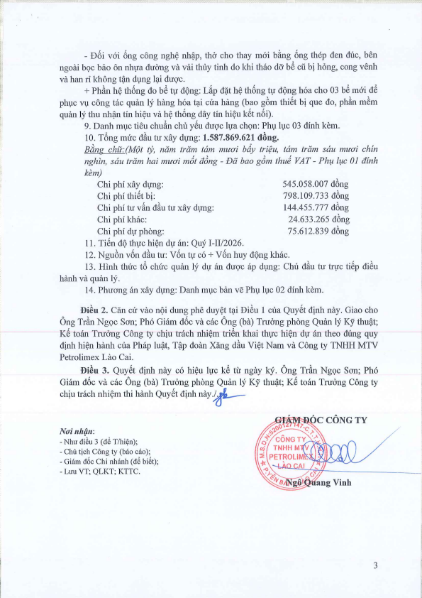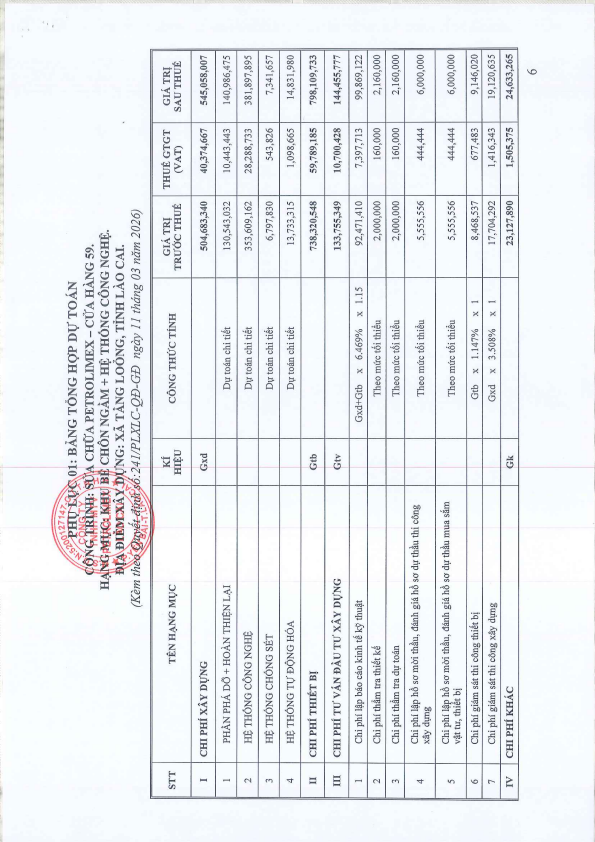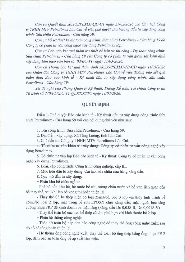 QUYẾT ĐỊNH V/v phê duyệt Báo cáo kinh tế - kỹ thuật đầu tư xây dựng. Công trình: Sửa chữa Petrolimex-CH59. Hạng mục: Khu bể chôn ngầm+hệ thống công nghệ. Địa điểm xây dựng: Xã Tằng Loỏng, Lào Cai